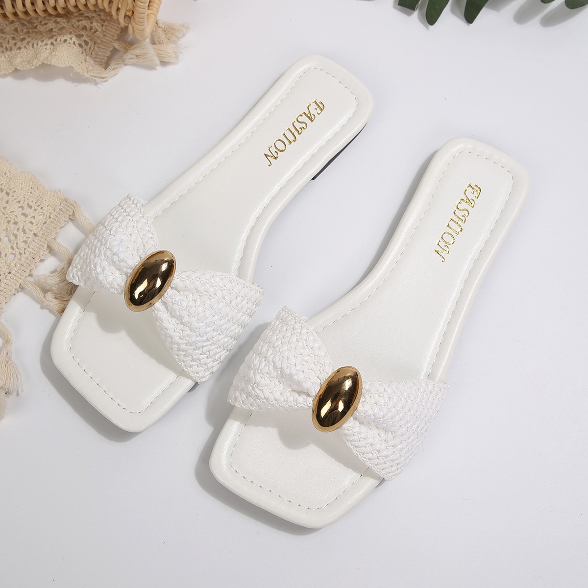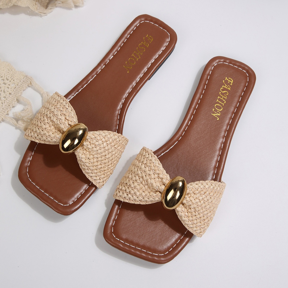 Product information: Pattern: Solid color Inner material: PU Colors: white, beige, black, brown Sizes: 36, 37, 38, 39, 40, 41, 42, 43 Bottom process: adhesive bottom Bottom material: rubber Trendy element: Metal Applicable occasions: daily wear Shoe upper material: Flyknit fabric Target audience: Adults Features: Wear resistant Style: Casual daily style Size: Packing list: Slippers*1pair